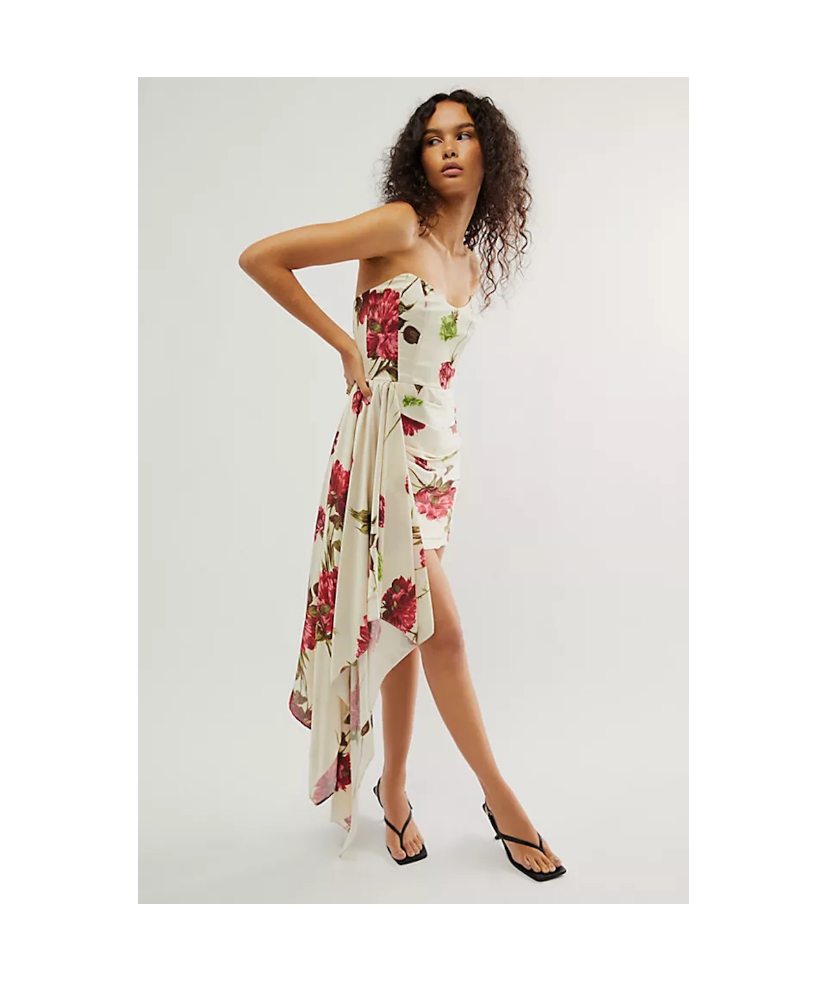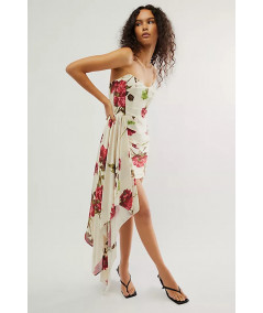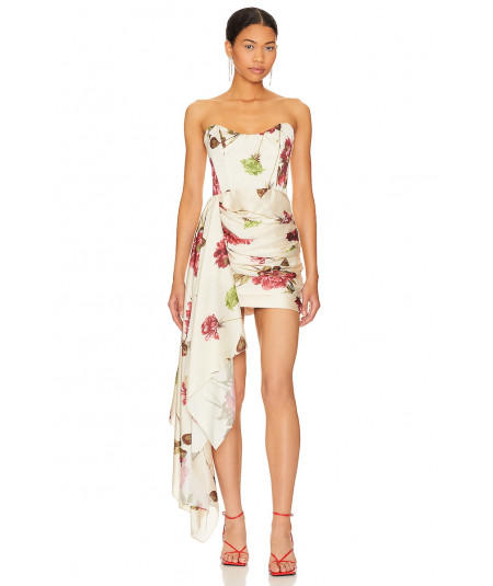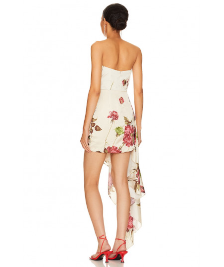 Vestido corto para mujer en tono marfil con estampado floral en tonos rojos y verdes. Presenta diseño strapless con corset estructurado, falda mini drapeada y un atrevido panel lateral largo tipo cola que cae en cascada, aportando movimiento y glamour. Ideal para cocteles, fiestas de noche y eventos especiales donde se busca un look moderno y sofisticado.