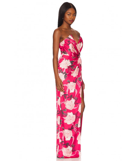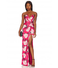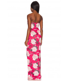 Vestido largo para mujer en color fresa con estampado floral en tonos claros. Presenta diseño strapless con escote cruzado tipo corazón, falda estilo pareo con drapeado frontal y abertura lateral pronunciada que estiliza la figura. Ideal para cocteles, matrimonios en clima cálido, fiestas de día y eventos donde se busca un look femenino, alegre y sofisticado.