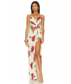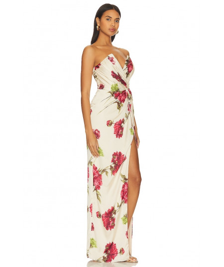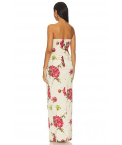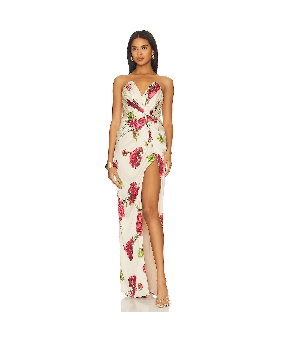 Vestido largo para mujer en tono beige marfil con estampado floral en rojos y verdes. Presenta diseño strapless con escote cruzado tipo corazón, drapeado frontal estilo pareo y abertura lateral pronunciada que alarga la silueta. Ideal para matrimonios en clima cálido, cocteles, fiestas de día y eventos donde se busca un look romántico y sofisticado.