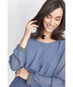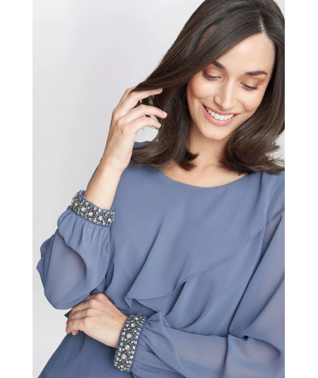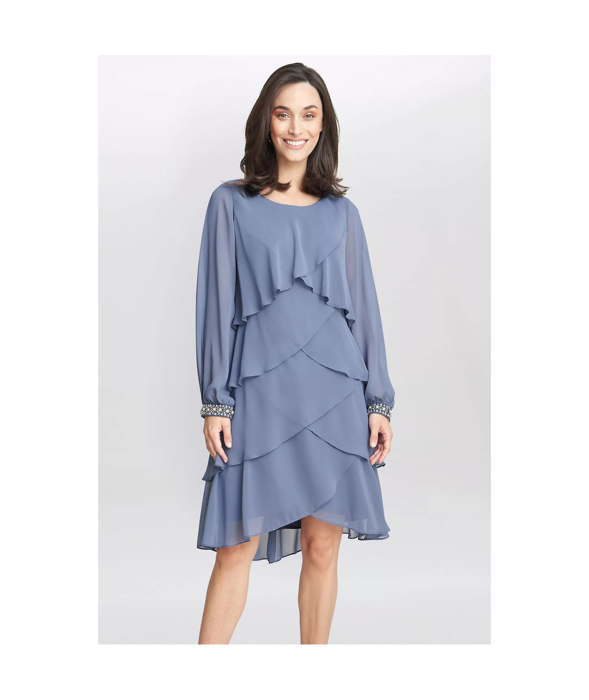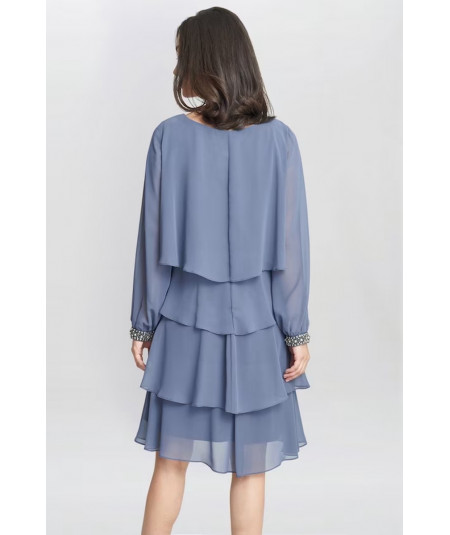 Vestido corto para mujer en tono gris azulado con capas de volantes en chiffon que caen en forma asimétrica. Presenta cuello redondo, mangas largas semitransparentes y puños adornados con pedrería que aportan brillo discreto. Su silueta suelta y fluida resulta cómoda y favorecedora, ideal para madre de la novia, cocteles, ceremonias y eventos formales de día o de noche.