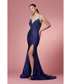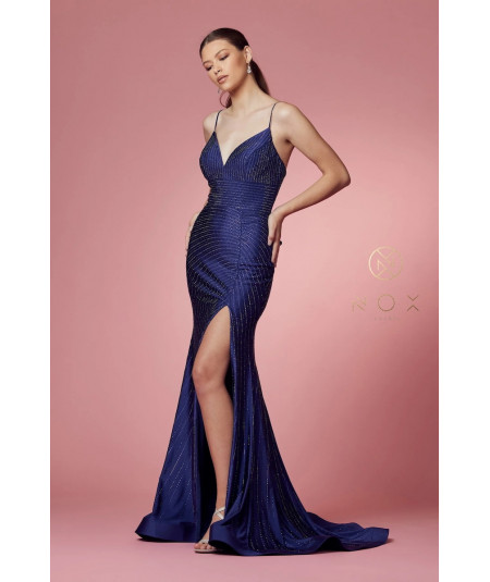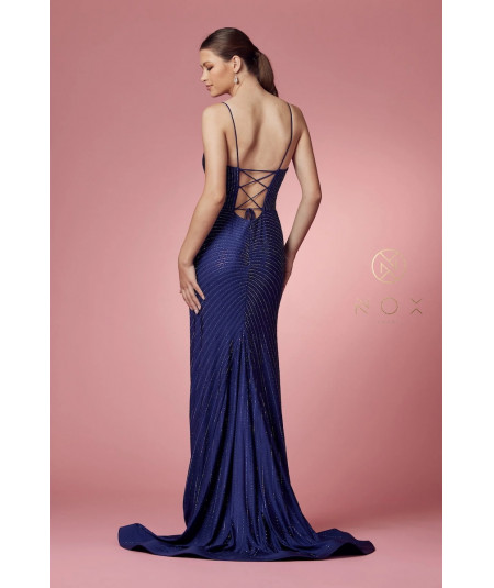 Vestido de gala para mujer en color azul marino con aplicaciones de pedrería distribuidas en patrones verticales y diagonales que estilizan la silueta. Presenta tirantes delgados, escote en V y una falda larga con abertura lateral que aporta elegancia y movimiento. El acabado brillante del tejido lo convierte en una opción ideal para galas, cocteles, graduaciones y eventos formales.