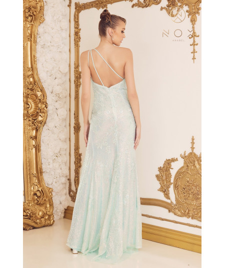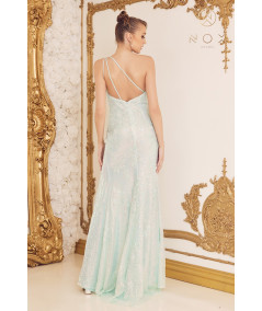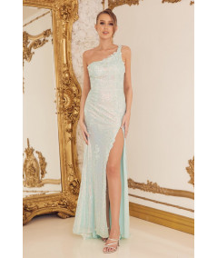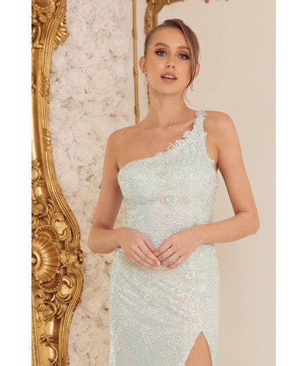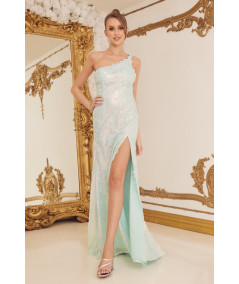 Vestido de gala para mujer en color verde menta brillante con diseño asimétrico de un solo hombro. Confeccionado en encaje y lentejuelas con acabado tornasol, presenta una silueta entallada que resalta la figura y una falda larga con abertura lateral rematada en encaje. Ideal para cocteles, galas, graduaciones y eventos formales donde se busca un look elegante, moderno y luminoso.