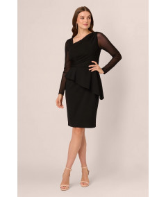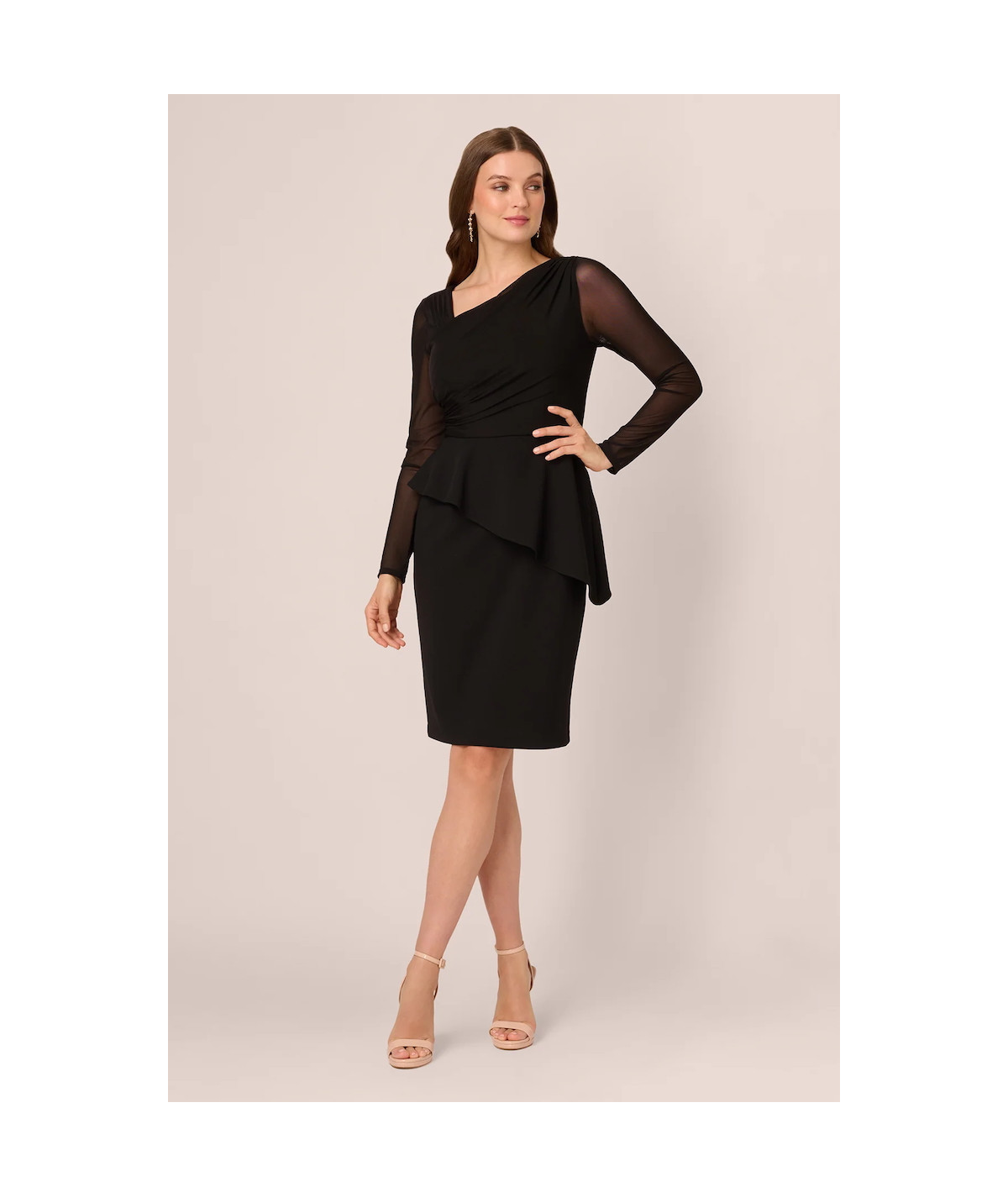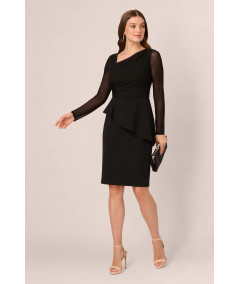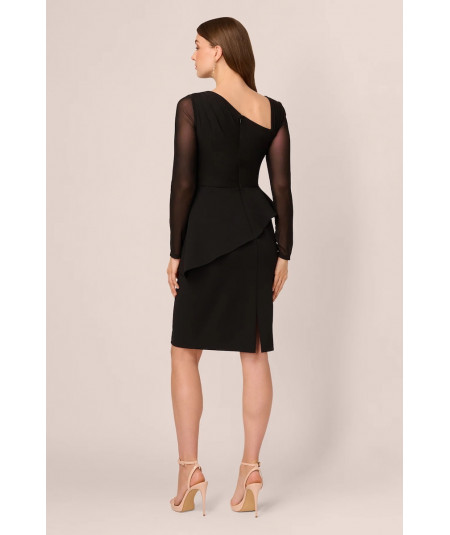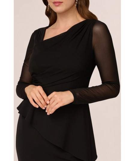 Vestido midi en color negro con diseño elegante y moderno. Presenta escote asimétrico, mangas largas transparentes y un detalle de peplum lateral que estiliza la cintura y aporta sofisticación. La silueta recta favorece la figura, convirtiéndolo en una opción ideal para cocteles, eventos formales, cenas especiales y ocasiones donde se busca un look refinado.