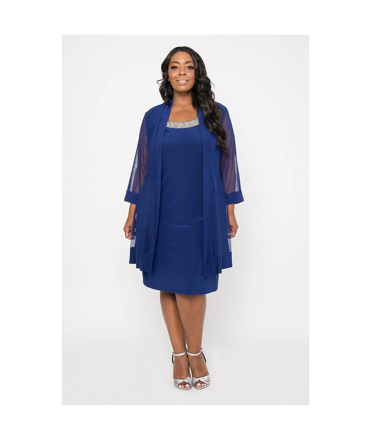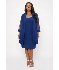 Vestido talla plus azul rey elegante para mujer. Diseño de dos piezas con saco en gasa, escote con pedrería y corte cómodo. Ideal para bodas, eventos formales y celebraciones especiales. Vestido plus size sofisticado de Smile Viste a la Moda.