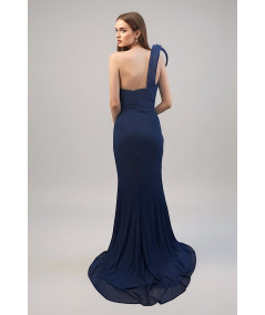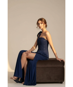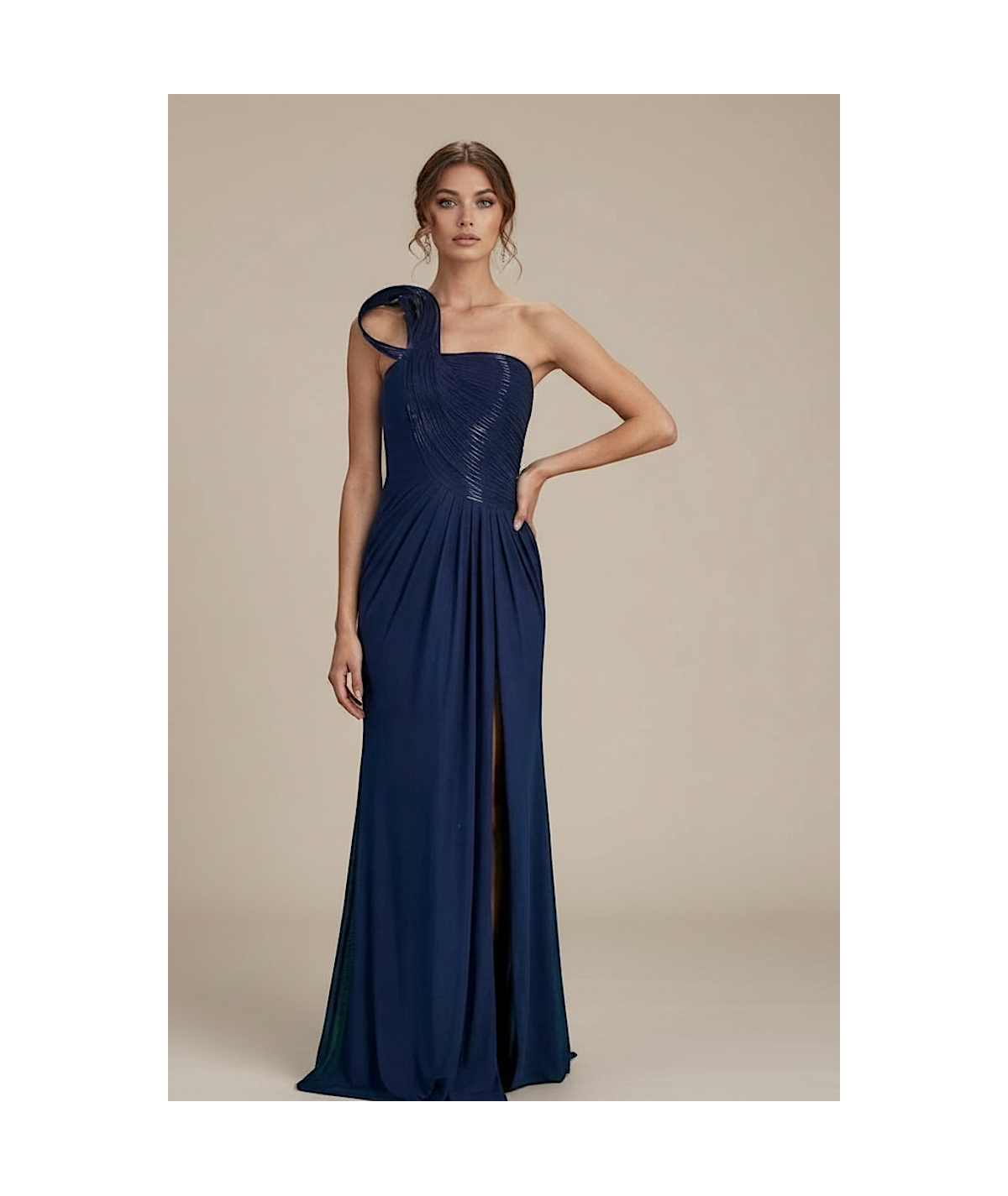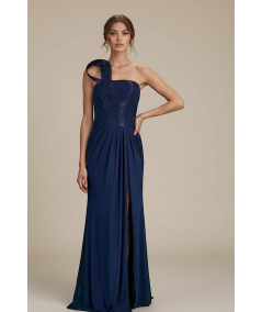 Vestido largo azul marino elegante para mujer. Diseño asimétrico de un solo hombro con plisado sofisticado y tela fluida de alta calidad. Ideal para galas, bodas y eventos formales. Vestido exclusivo de Smile Viste a la Moda.