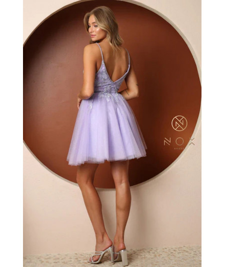Vestido corto de fiesta en tono lila con delicado encaje bordado en el busto y falda de tul ligera. Diseño juvenil y elegante, ideal para eventos especiales y celebraciones.