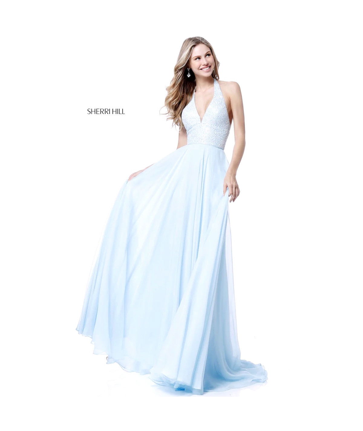 Vestido largo de fiesta en tono celeste con escote halter profundo y busto con acabado brillante. Falda amplia y fluida que aporta movimiento y elegancia, ideal para eventos formales y ocasiones especiales.
