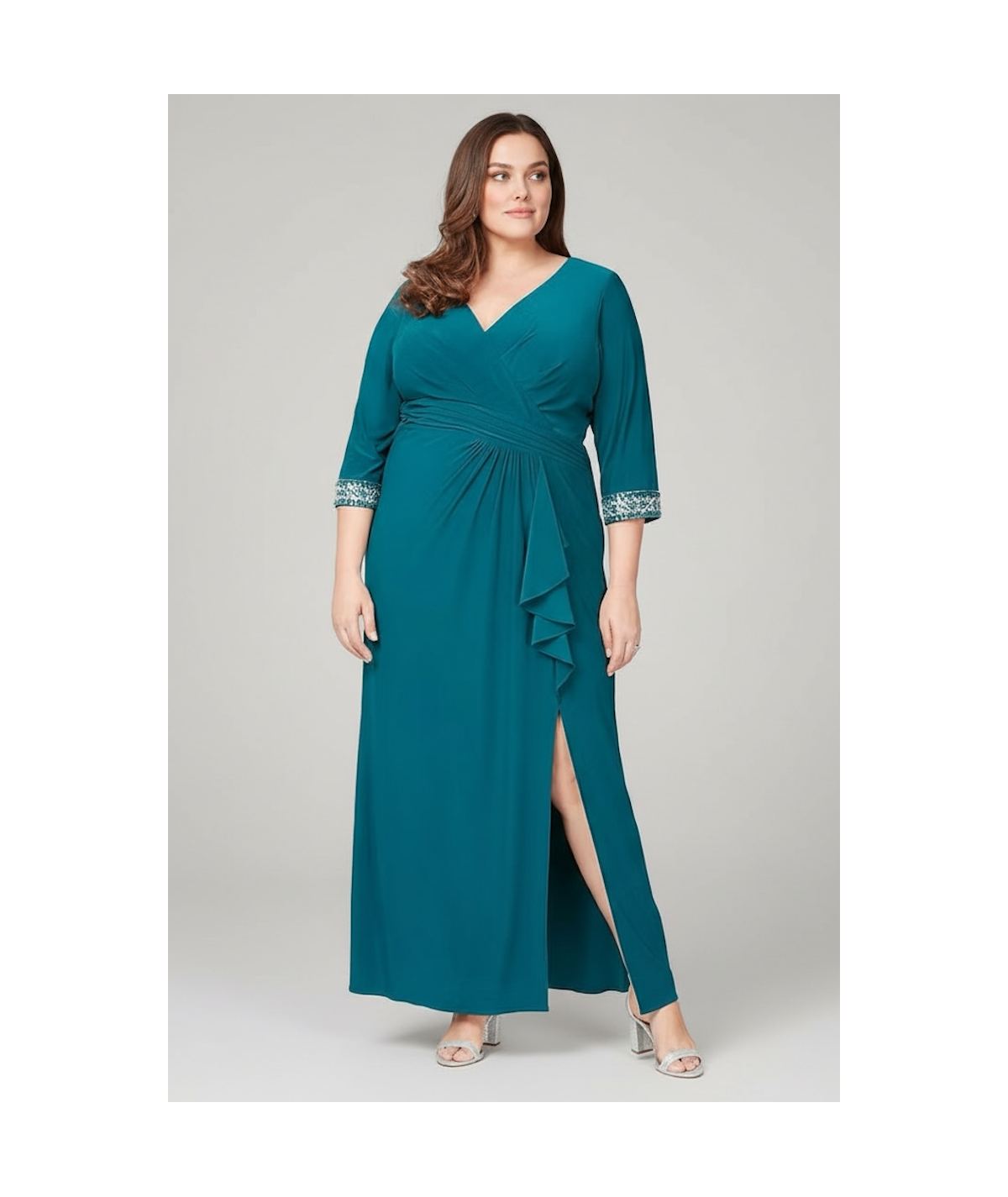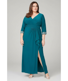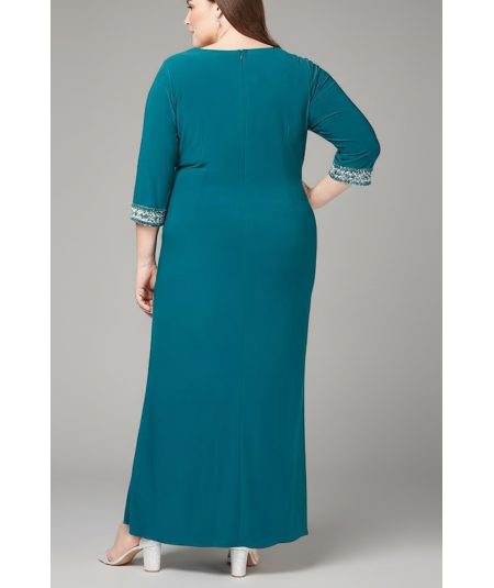 vestido largo de fiesta, vestido elegante plus size, vestido petróleo mujer, vestido formal noche, vestido con mangas tres cuartos, vestido para boda, vestido de gala mujer