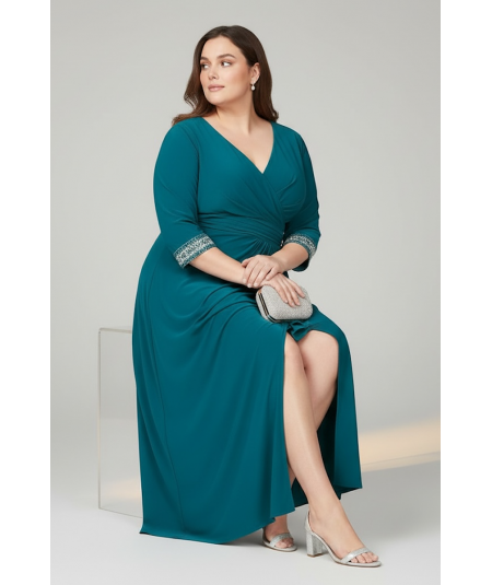 Vestido largo de fiesta en tono petróleo con escote en V cruzado, mangas tres cuartos y delicado detalle decorativo en los puños. Diseño favorecedor con abertura frontal que aporta elegancia y comodidad, ideal para eventos formales.