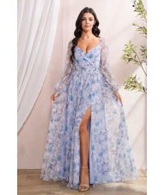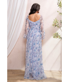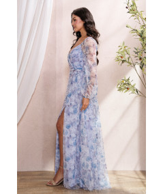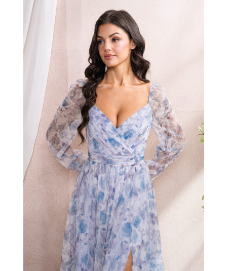 Vestido largo de fiesta en tono azul con estampado floral delicado, escote en V cruzado y mangas largas transparentes. Diseño romántico y femenino con falda fluida y abertura frontal, ideal para eventos formales y celebraciones especiales.