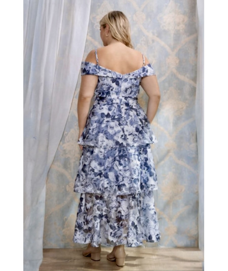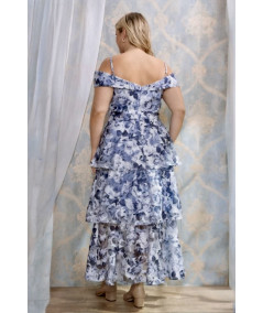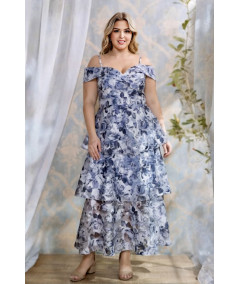 Vestido midi elegante en tono azul con estampado floral y diseño en capas. Presenta escote off-shoulder con tirantes finos, falda con vuelos que aporta movimiento y un ajuste favorecedor, ideal para eventos formales, celebraciones y ocasiones especiales.