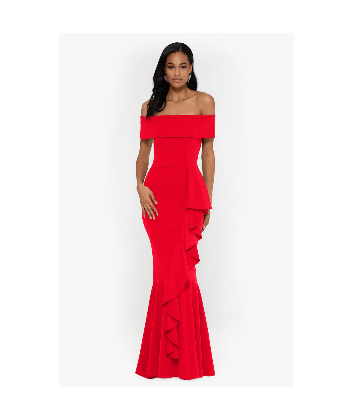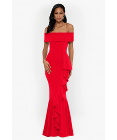 Vestido largo rojo de corte sirena con escote off shoulder que resalta los hombros y estiliza la figura. Diseño estructurado con detalle de olanes laterales que aportan movimiento y sofisticación, ideal para galas y eventos formales.