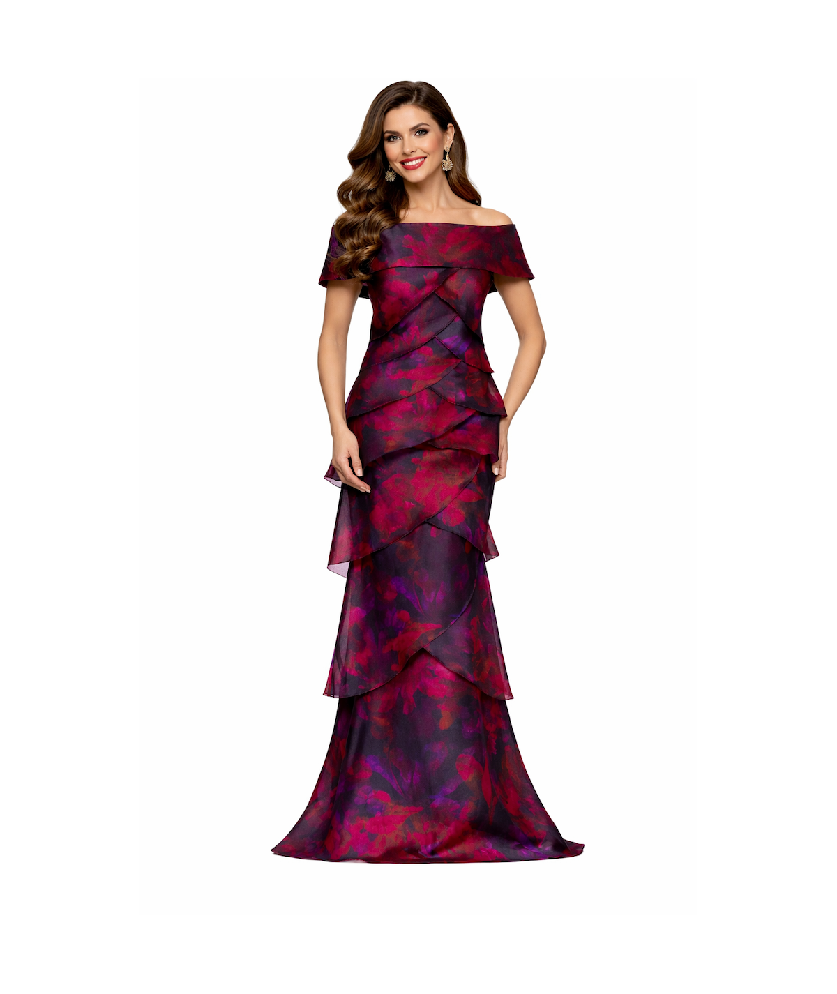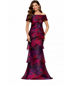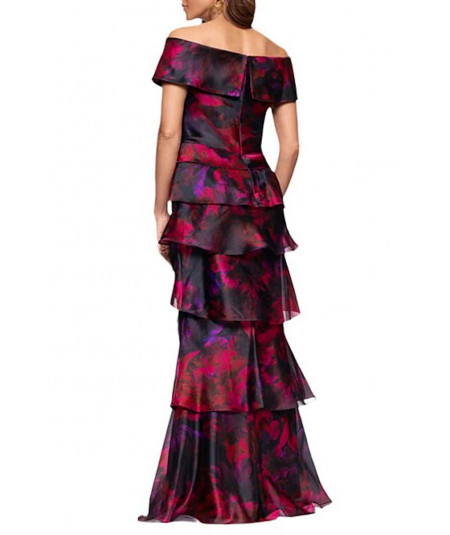 vestido largo floral vino, vestido off shoulder elegante, vestido gala mujer, vestido largo con capas, vestido noche estampado, vestido formal sofisticado, vestido fiesta elegante mujer