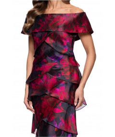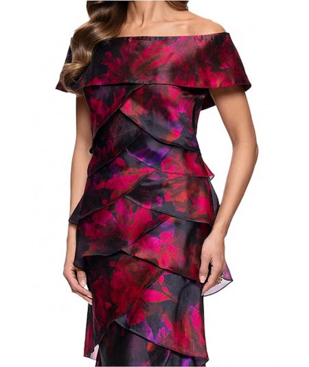 Vestido largo con estampado floral en tonos vino y fucsia sobre fondo oscuro. Diseño off shoulder con capas asimétricas que aportan movimiento y elegancia, ideal para galas y eventos formales de noche.