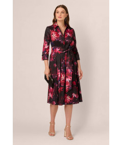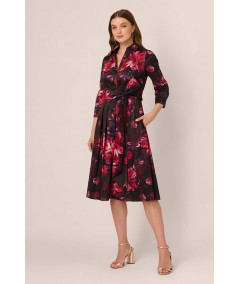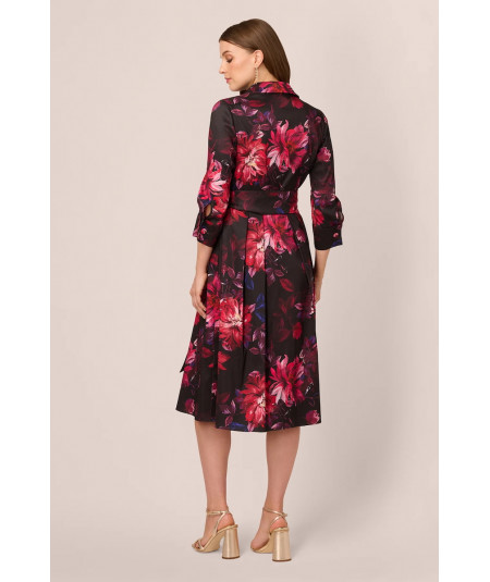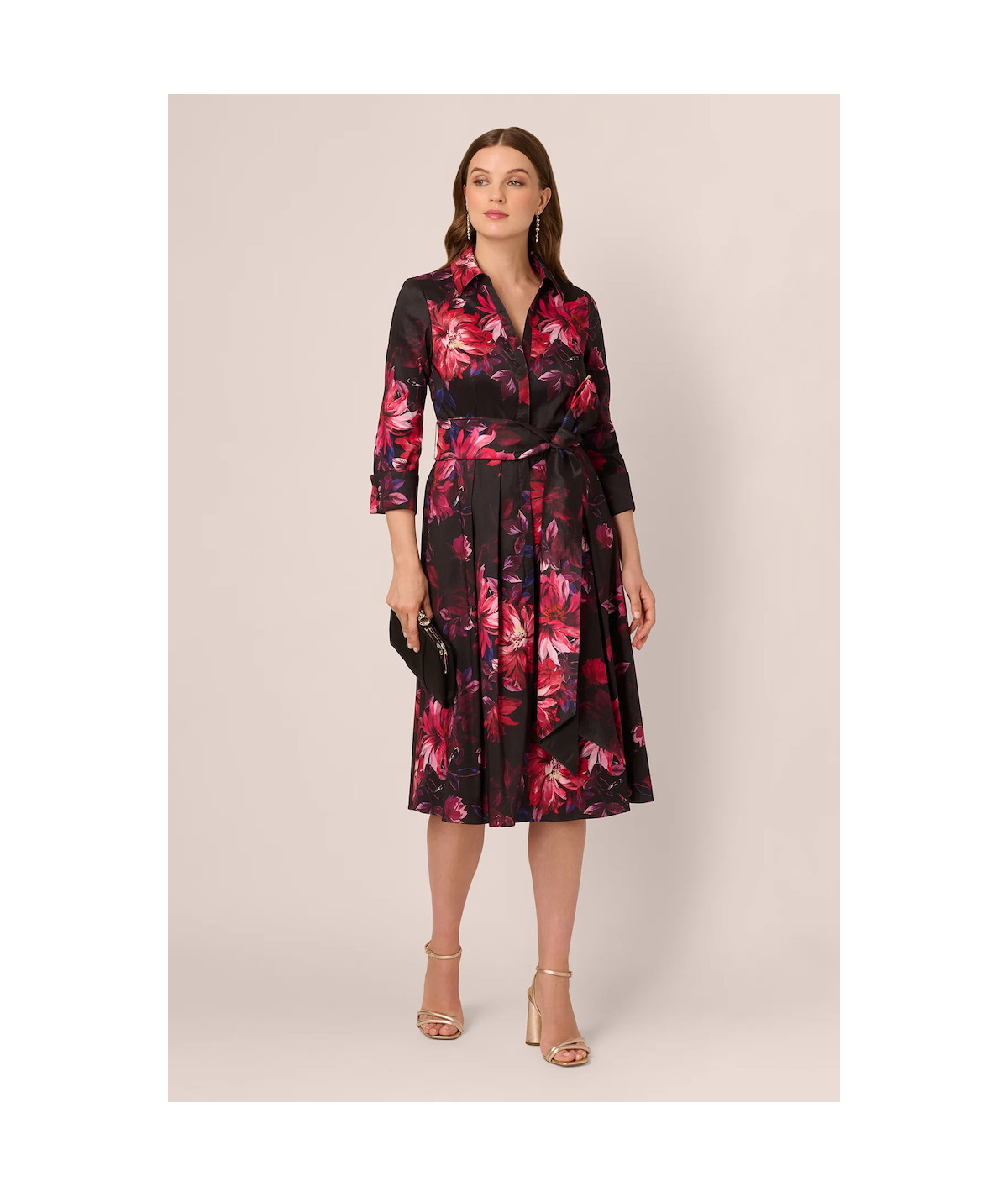 Vestido midi estampado floral en tonos rojo y rosa sobre fondo negro. Diseño camisero con escote en V, manga tres cuartos y cinturón anudado que estiliza la cintura. Falda con vuelo elegante ideal para eventos formales y celebraciones especiales.