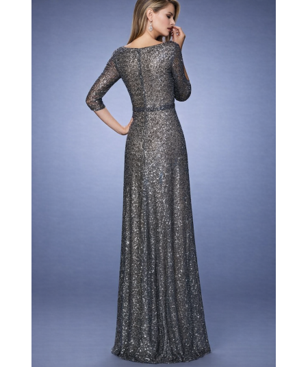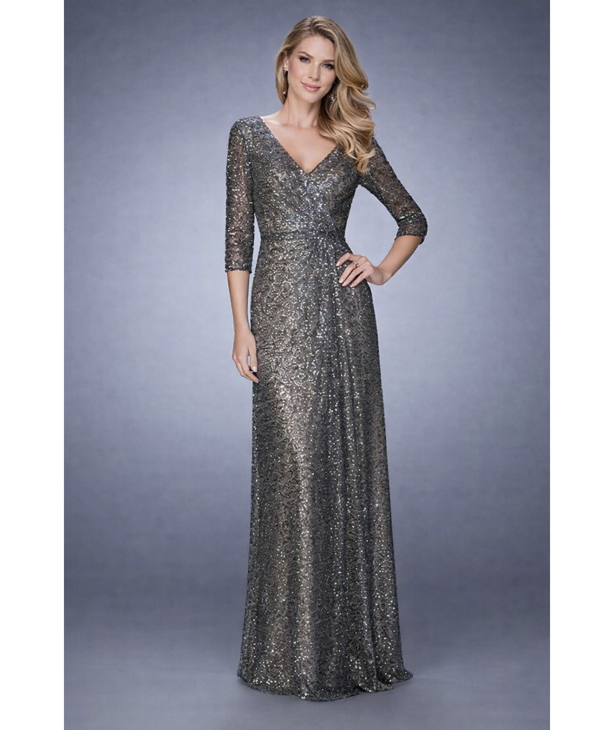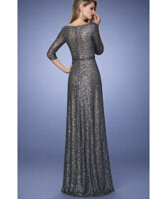 vestido largo lentejuelas gris, vestido noche elegante mujer, vestido formal con brillo, vestido gala manga 3/4, vestido largo escote V, vestido fiesta sofisticado, vestido elegante metálico