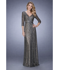 Vestido largo de noche en tono gris metálico con acabado de lentejuelas que aporta brillo sofisticado. Escote en V cruzado y mangas tres cuartos que estilizan la silueta, con caída fluida ideal para galas y eventos formales.