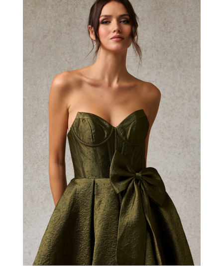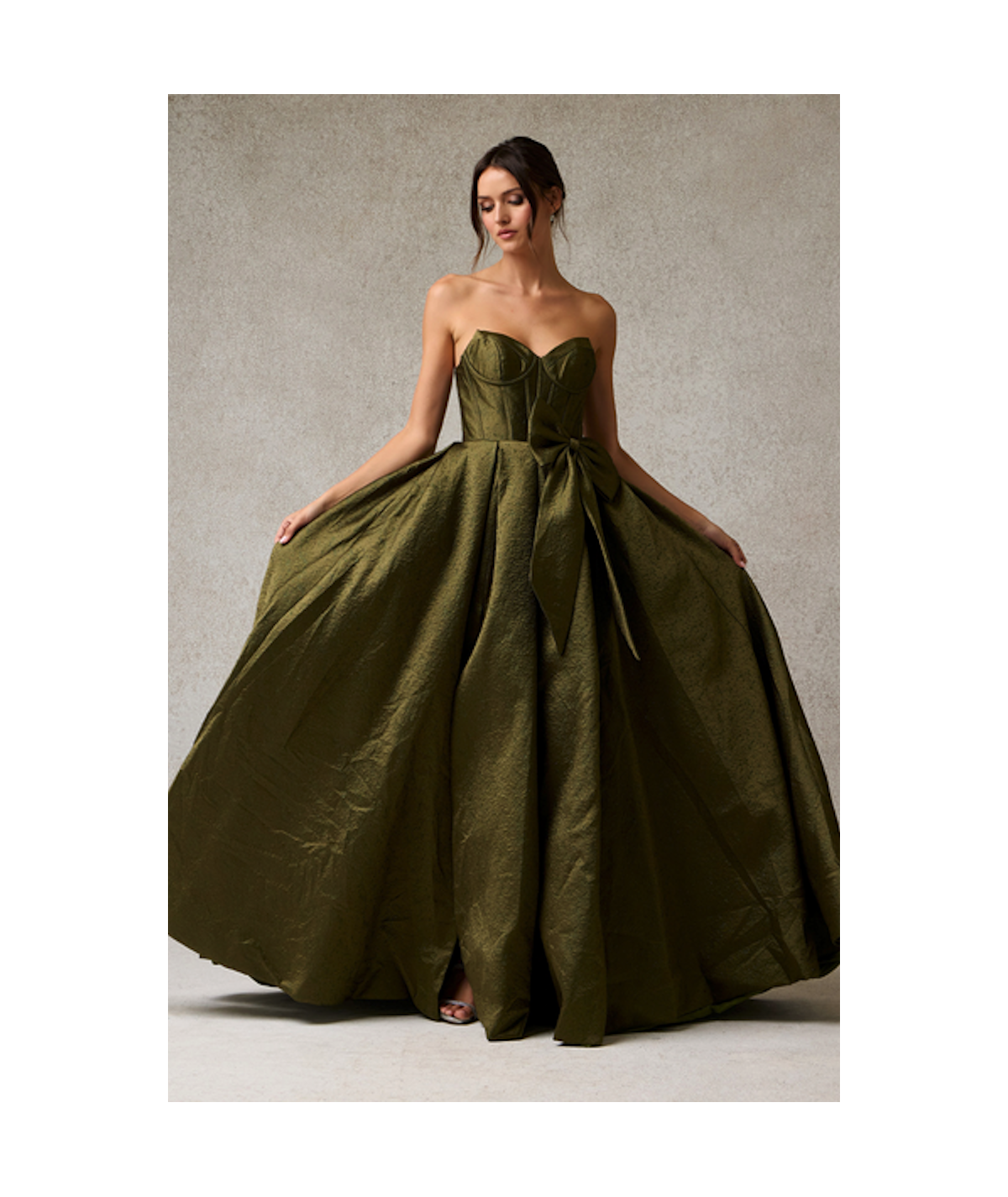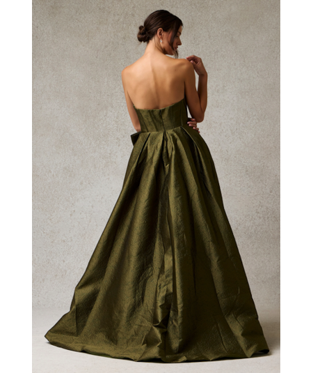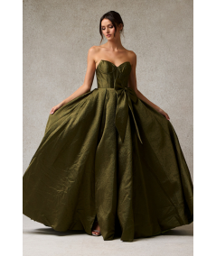 Vestido largo strapless en tono verde oliva con corset estructurado y escote corazón. Diseño elegante con falda amplia de gran volumen y lazo decorativo en la cintura que aporta un toque femenino y sofisticado. Ideal para galas y eventos de etiqueta.