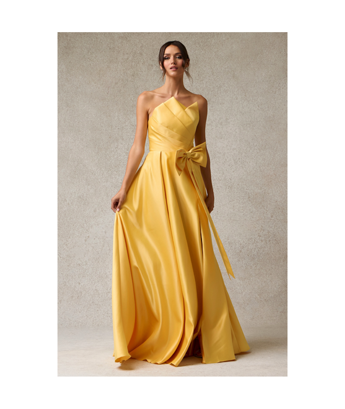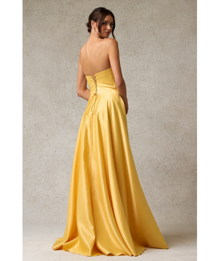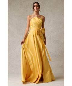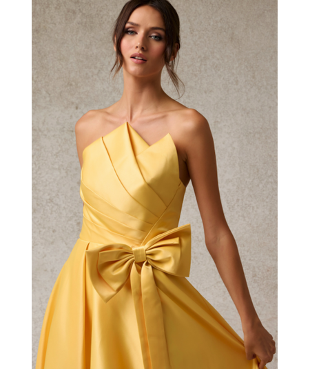 Vestido largo strapless en tono amarillo vibrante con escote estructurado y delicado drapeado en el cuerpo. Diseño elegante con falda amplia de gran volumen y lazo decorativo en la cintura que aporta un toque femenino y sofisticado. Ideal para galas y eventos especiales.