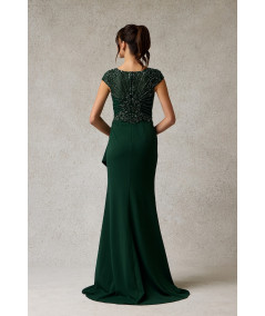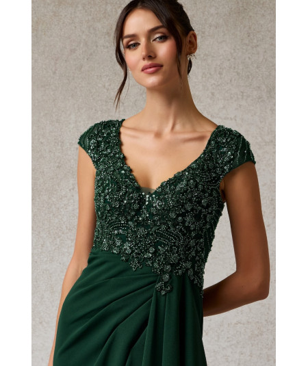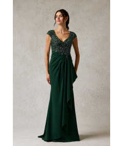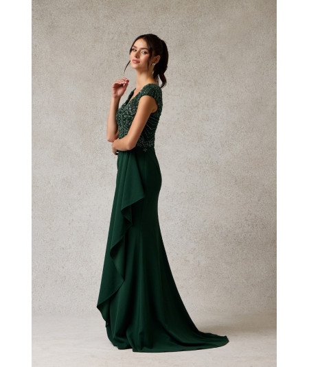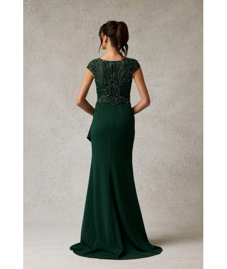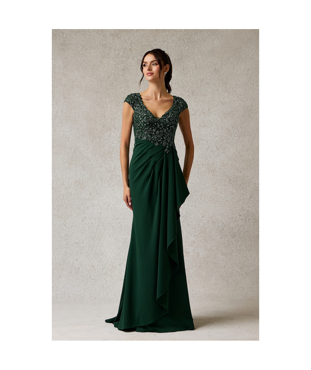 Vestido largo de gala en tono verde esmeralda con escote en V y delicado bordado con pedrería en el cuerpo. Diseño ajustado con elegante drapeado lateral que estiliza la silueta y aporta movimiento. Ideal para bodas, galas y eventos formales de noche.
