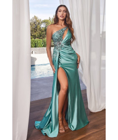 Vestido turquesa elegante de un hombro con pedrería, tela satinada y abertura lateral. Perfecto para eventos formales y ocasiones especiales.