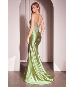 Vestido verde satinado con corset estructurado, escote corazón y abertura lateral. Ideal para eventos elegantes y ocasiones especiales.