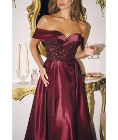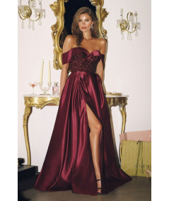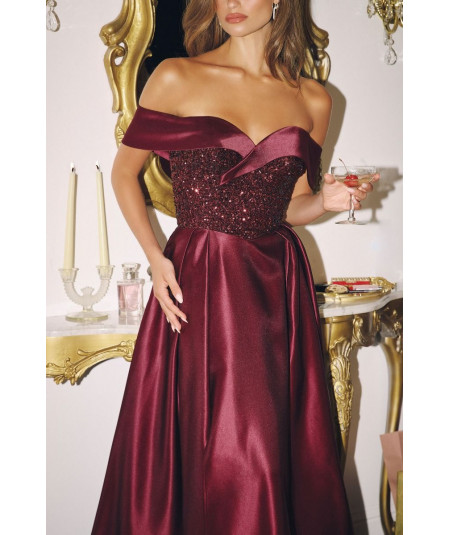 El vestido vino elegante LaDivine off shoulder con brillo y falda satinada es una pieza de lujo diseñada para destacar con sofisticación en eventos especiales. Su diseño combina elegancia clásica con un toque moderno, creando un look impactante y femenino.