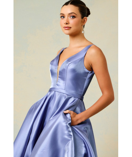 Confeccionado en tela satinada de alta calidad, este vestido destaca por su acabado brillante y suave al tacto. Además, incluye bolsillos discretos, combinando funcionalidad con diseño sofisticado.