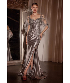 El vestido plata elegante La Divine con encaje, mangas tipo capa y abertura lateral es una pieza de alta sofisticación que combina elegancia clásica con detalles de alta costura. Su diseño estilizado tipo sirena realza la figura, creando un look refinado, femenino y de gran impacto.