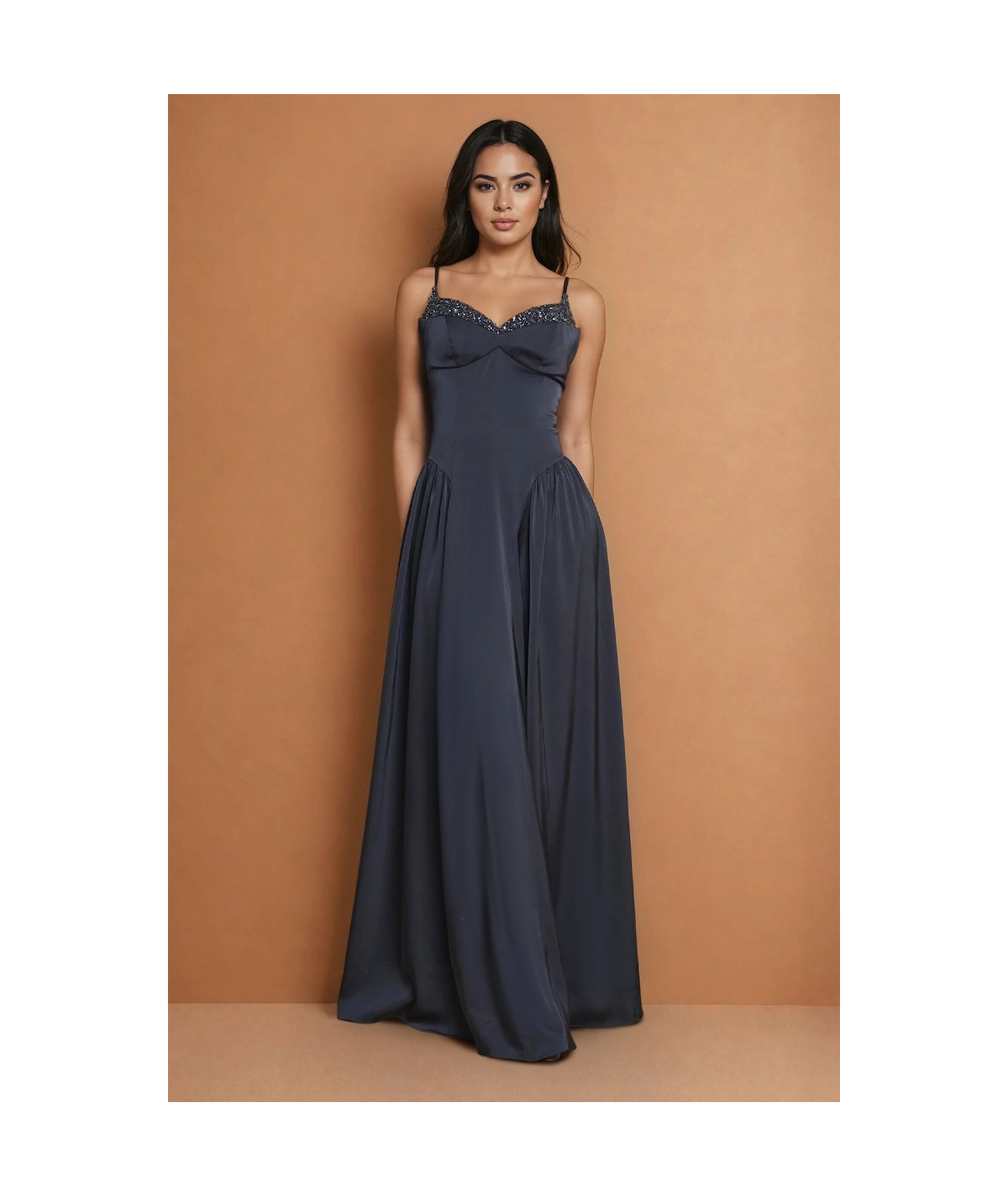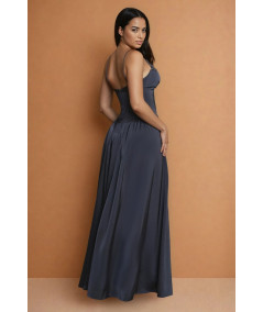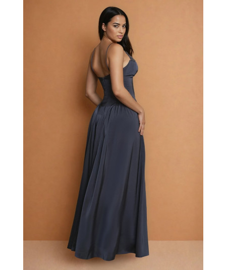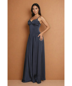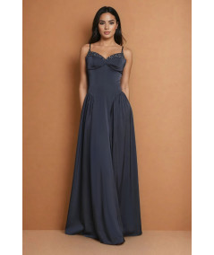 El vestido azul gris elegante La Divine con tirantes finos, pedrería y falda amplia fluida es una pieza sofisticada que combina elegancia minimalista con detalles sutiles de brillo. Su silueta tipo A estiliza la figura, creando un look femenino, refinado y atemporal.