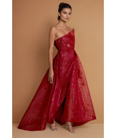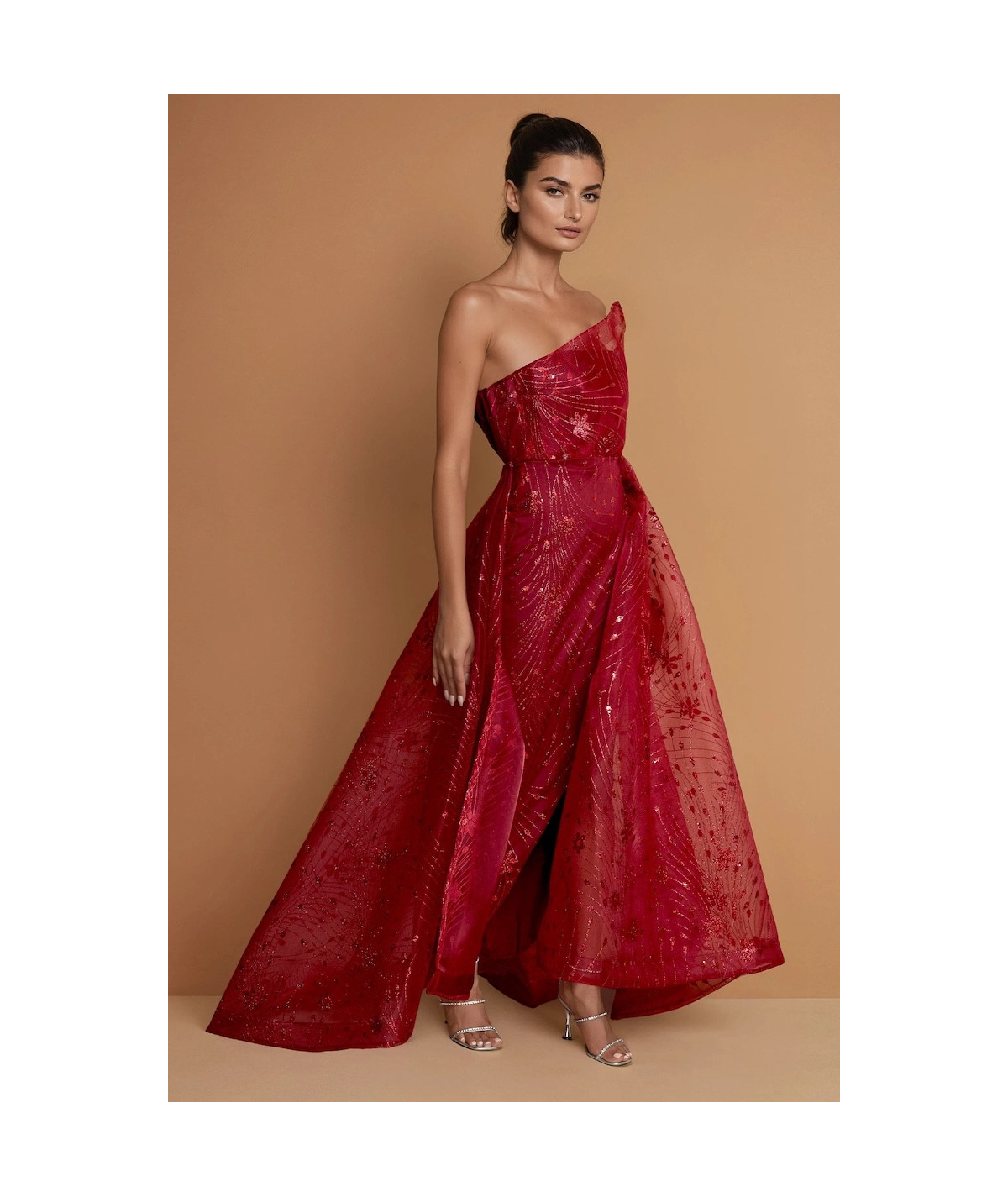 El vestido rojo elegante con brillo, transparencias y falda con cola desmontable es una pieza de alta costura diseñada para destacar con glamour, sofisticación y un estilo único. Su diseño combina elegancia moderna con detalles impactantes que elevan cualquier look.