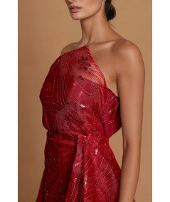 Este vestido elegante rojo para mujer es una excelente opción para quienes buscan un look sofisticado y llamativo. Los vestidos de un hombro con brillo y detalles de transparencias son tendencia en moda femenina, especialmente en eventos como galas, bodas o celebraciones formales.