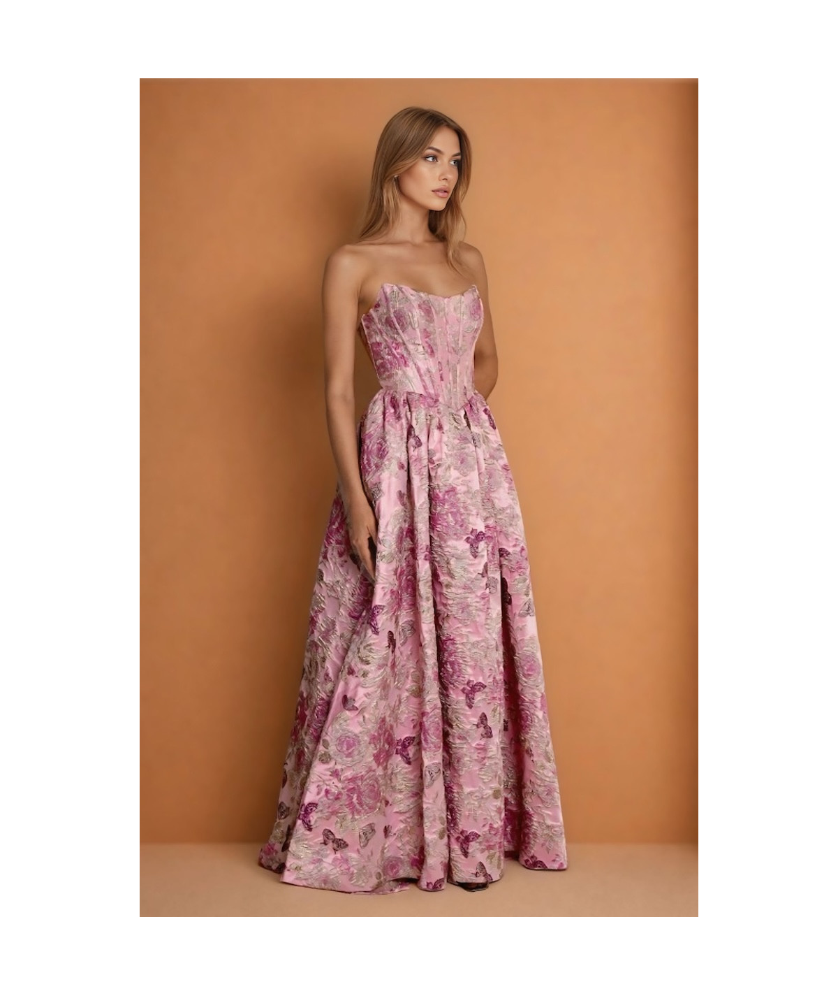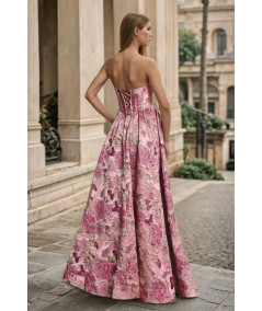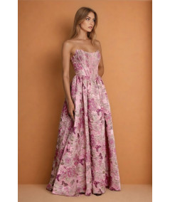 El vestido rosa elegante strapless con corset estructurado y falda amplia jacquard floral es una pieza sofisticada que combina romanticismo, elegancia y un diseño de alta costura ideal para eventos especiales. Su silueta tipo princesa aporta volumen y presencia, creando un look femenino y refinado.