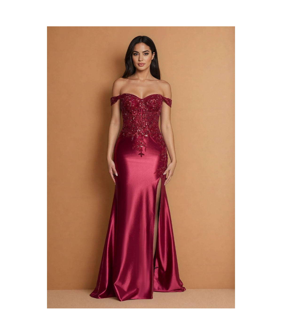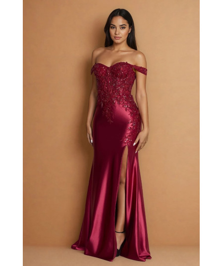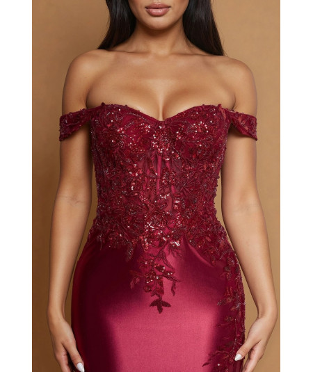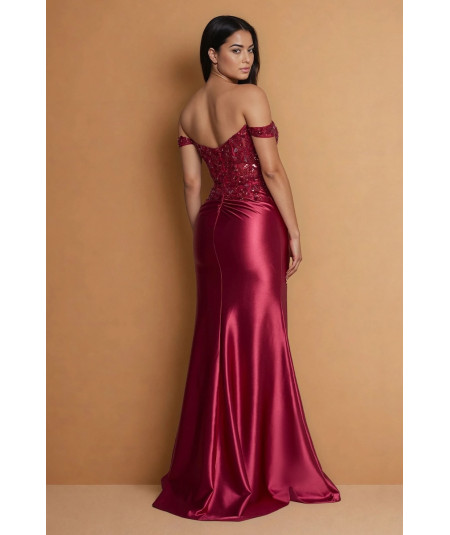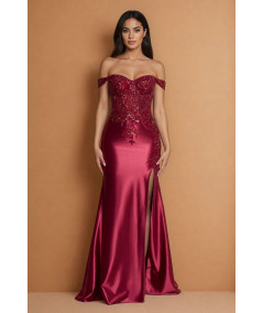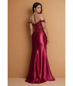 El vestido borgoña elegante off shoulder con encaje, pedrería y abertura lateral es una pieza sofisticada que combina sensualidad, elegancia y un diseño de alta costura ideal para eventos especiales. Su silueta tipo sirena realza la figura, creando un look estilizado y femenino.