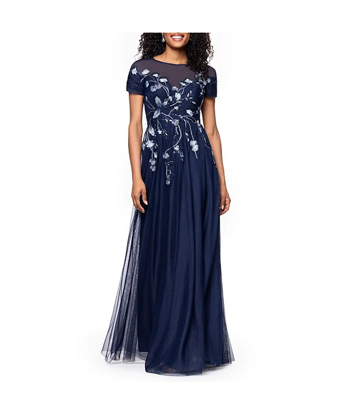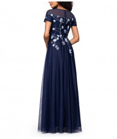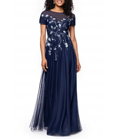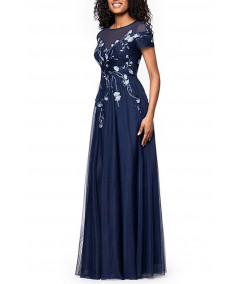 vestido elegante mujer, vestido azul marino elegante largo, vestido con tul bordado mujer, vestido mangas cortas elegante, vestido de gala mujer, vestido noche elegante, vestido sofisticado mujer, vestido romántico mujer, vestidos elegantes 2026, vestido formal mujer