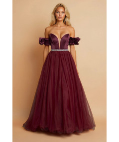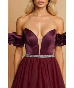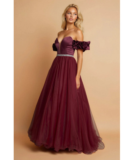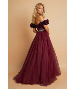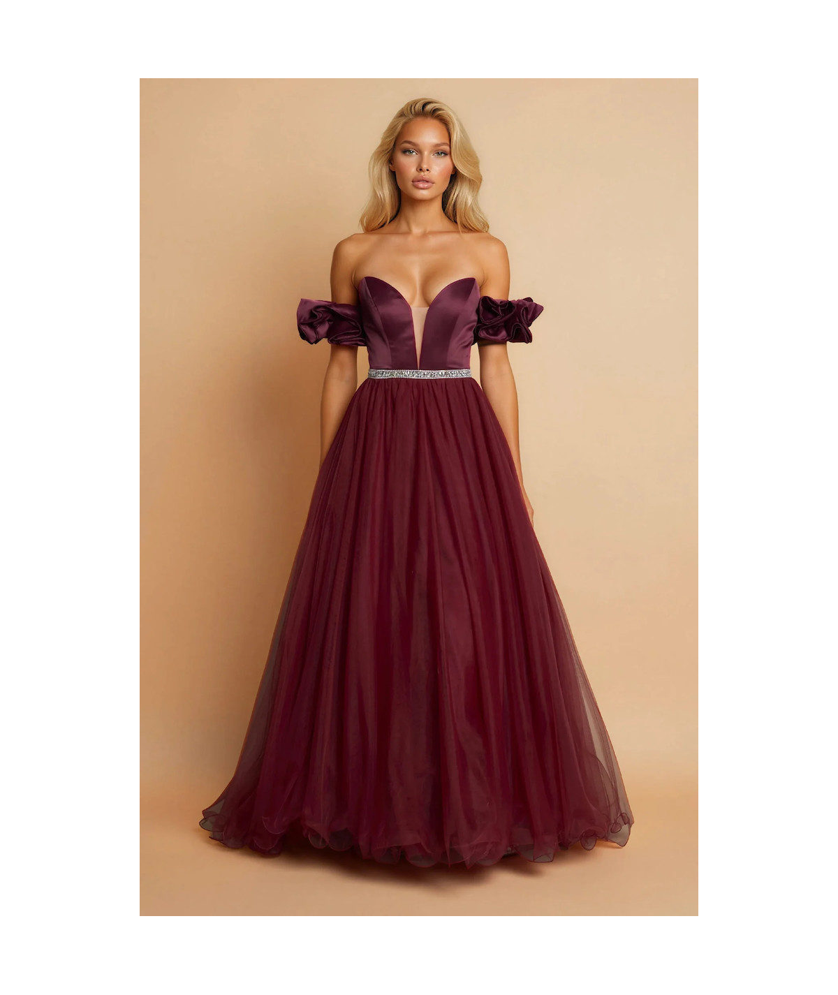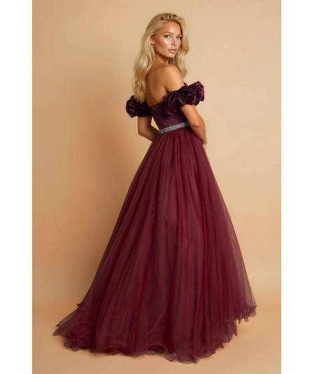 vestido vino mujer, vestido de gala elegante, vestido princesa tul mujer, vestido largo con volumen, vestido de fiesta elegante, vestido con escote profundo, vestido sofisticado mujer, vestido para evento especial, vestido noche elegante, vestido formal femenino