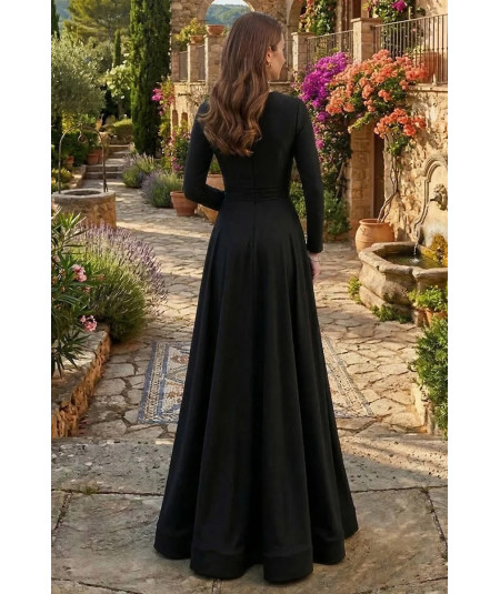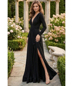 Vestido largo elegante en color negro con manga larga, escote profundo y abertura en pierna que estiliza la silueta. Su diseño sofisticado y femenino es ideal para galas, eventos formales y ocasiones especiales.