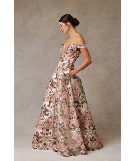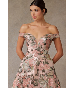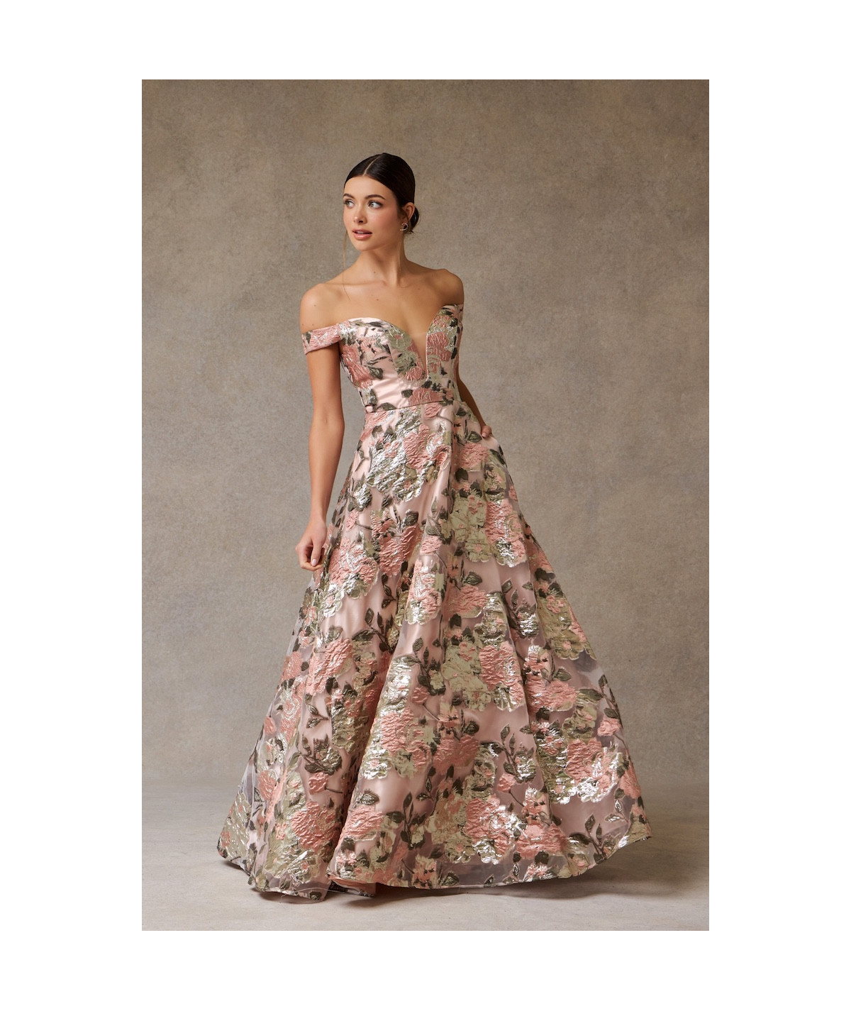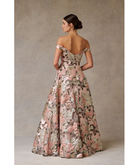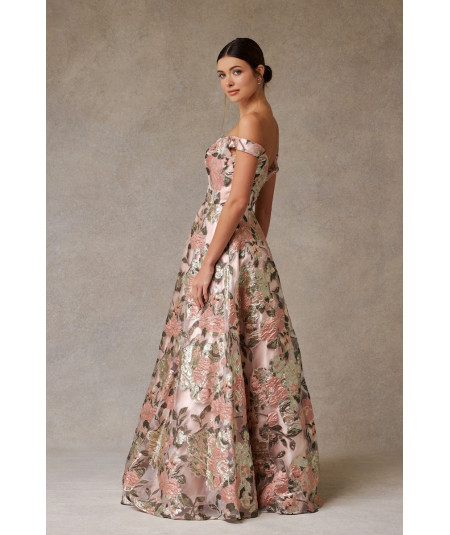 vestido floral elegante, vestido largo rosa mujer, vestido corte A fiesta, vestido off shoulder floral, vestido quinceaños elegante, vestido boda invitada floral, vestido gala mujer, vestido princesa estampado