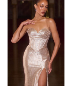 vestido champagne elegante, vestido largo con pedrería, vestido gala mujer, vestido corset fiesta, vestido brillante noche, vestido abertura lateral elegante, vestido graduación lujo, vestido dorado champagne mujer