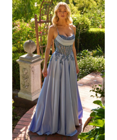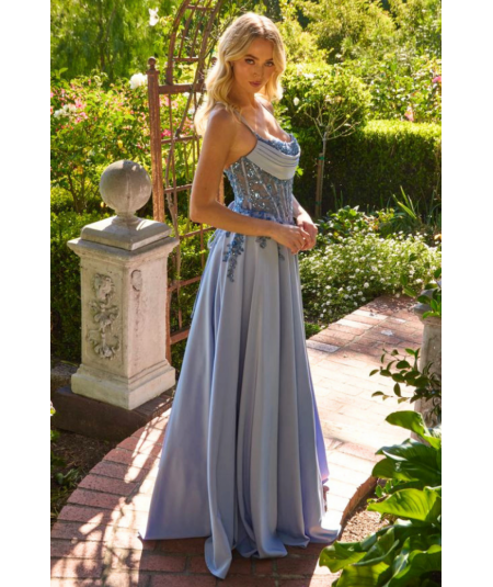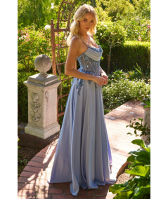 vestido largo celeste, vestido de gala celeste, vestido satinado mujer, vestido con pedrería, vestido elegante largo, vestido para graduación, vestido formal celeste, vestido corset fiesta